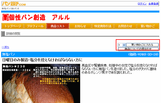 ■商品閲覧のページで、「買い物かごに入れる」と書かれたボタンを押すと、その商品が入った状態で買い物かごの画面が表示されます。購入個数については、「買い物かごに入れる」と書かれたボタンの隣に、個数を選択するボックスがありますので、そこで選択してください。初期設定では個数が1になっています(図1)。