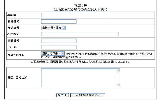 ■必要事項を入力して、「入力内容を確認する」のボタンを押すと、購入内容の確認画面が表示されます。すべての入力項目に間違いがないことを確認し、「この内容で注文する」のボタンを押します。すると、発注が完了します。 |